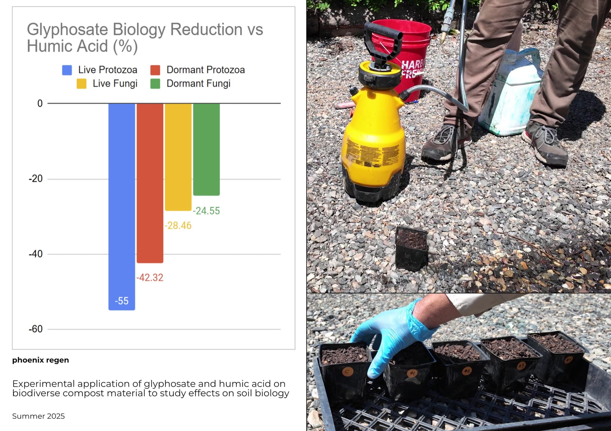 In order to study this effect, Phoenix Regen conducted a small experiment in Summer 2025, spraying a biologically active and diverse compost soil with two mixes: (1) a 2% glyphosate solution and (2) a 0.15% humic acid solution. These concentrations were chosen because each product is commonly used at that concentration in habitat restoration projects.